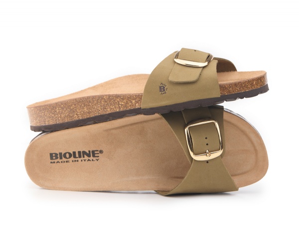 Pianella regolazione un fibbione con tomaia in pelle nabuk senza cuciture, sottopiede in gomma-sughero rivestito in pelle e battistrada in EVA (etil vinil acetato) 8mm.