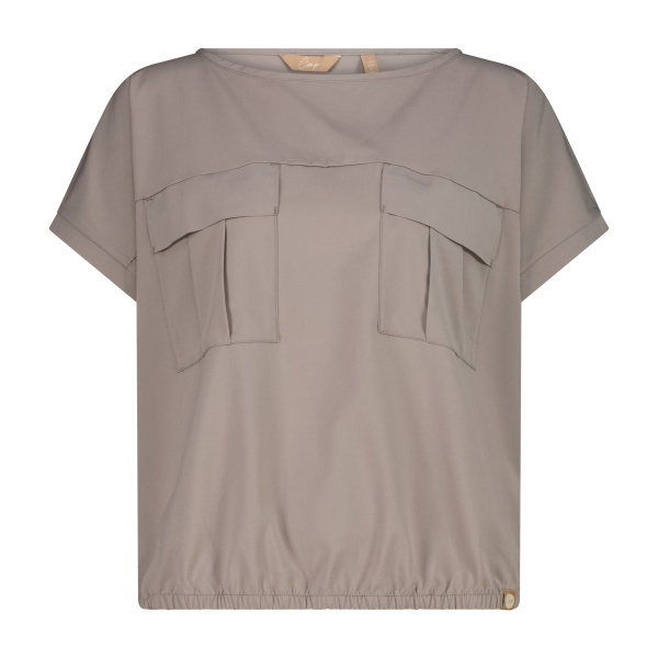 Il capo è arricciato sul fondo da un elastico, che ne valorizza la forma senza comprimere. Due tasche frontali completano il design Leggera e versatile, questa T-shirt unisce stile casual e funzionalità tecnica, ideale per look dinamici e attivi.