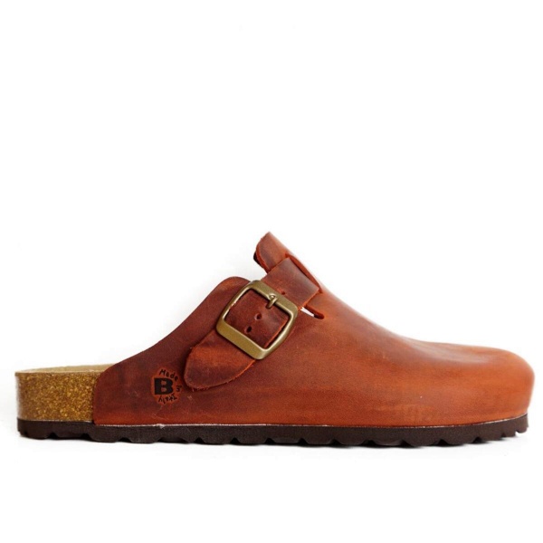 Sabot con tomaia in pelle nabuk ingrassato lavorato senza cuciture. Regolabile, con cinturino dotato di fibbia in metallo. Plantare dalla forma anatomica in gomma-sughero, suola gomma Vibram®.