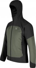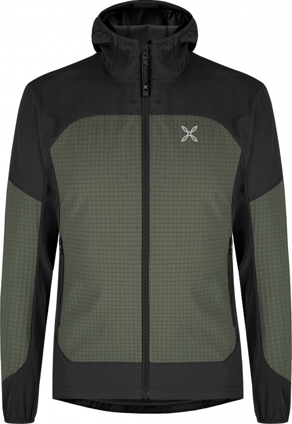 • Tessuto poliestere stretch riciclato con trattamento PFAS FREE DWR con costruzione ibrida double-weave e softshell