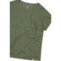 Il tessuto, composto da poliestere, lyocell ed elastan, è leggero ed elasticizzato e presenta una maglia fine che assicura una vestibilità naturale e una caduta morbida, seguendo i movimenti del corpo senza costringere. Il lyocell, fibra di origine cellulosica, conferisce una mano liscia e raffinata e migliora la traspirabilità e la gestione dell’umidità, mentre il poliestere garantisce resistenza e stabilità dimensionale nel tempo.